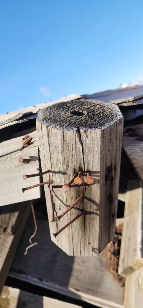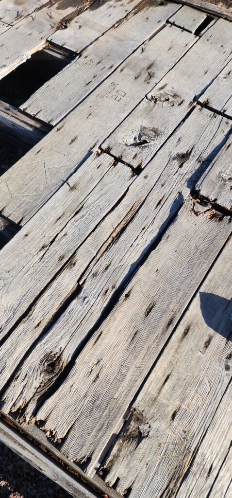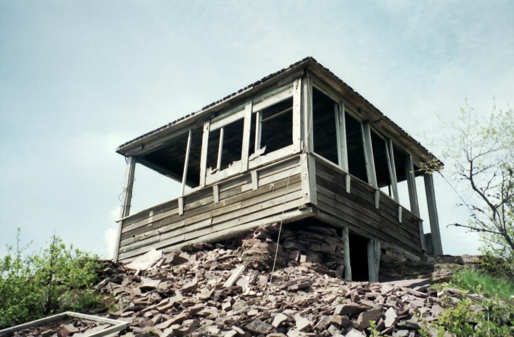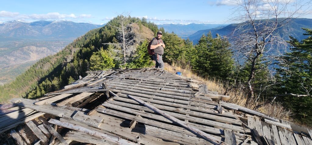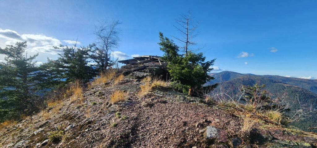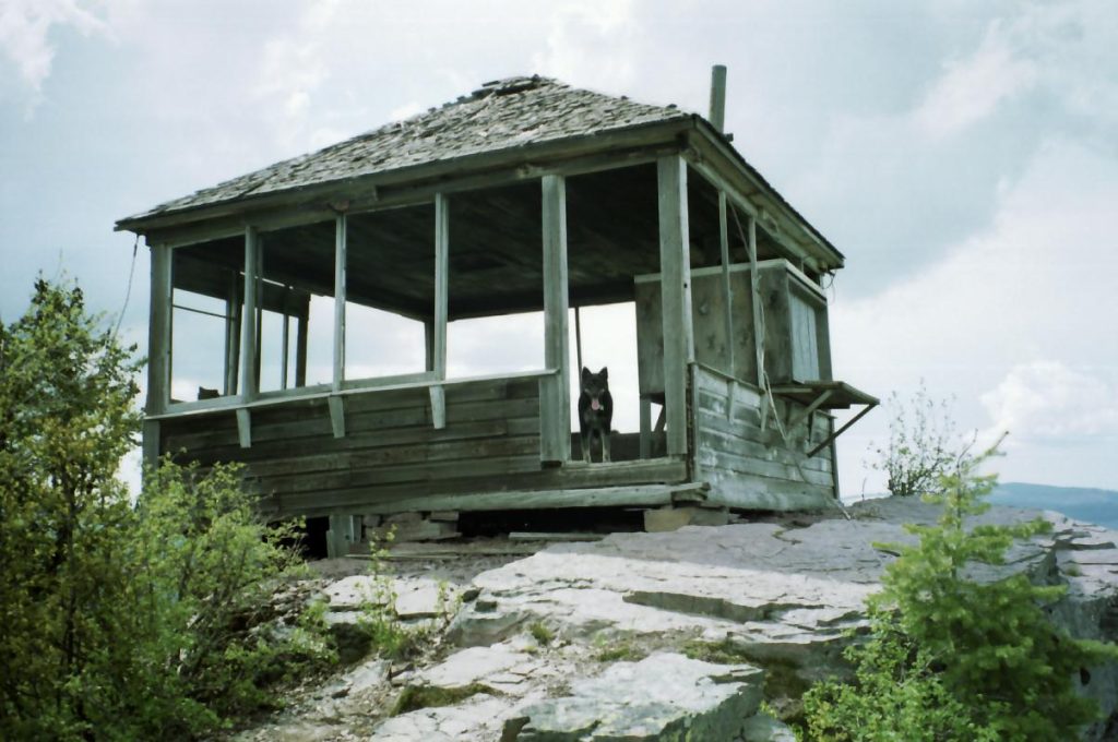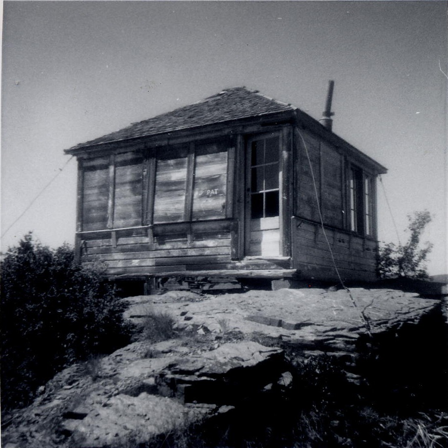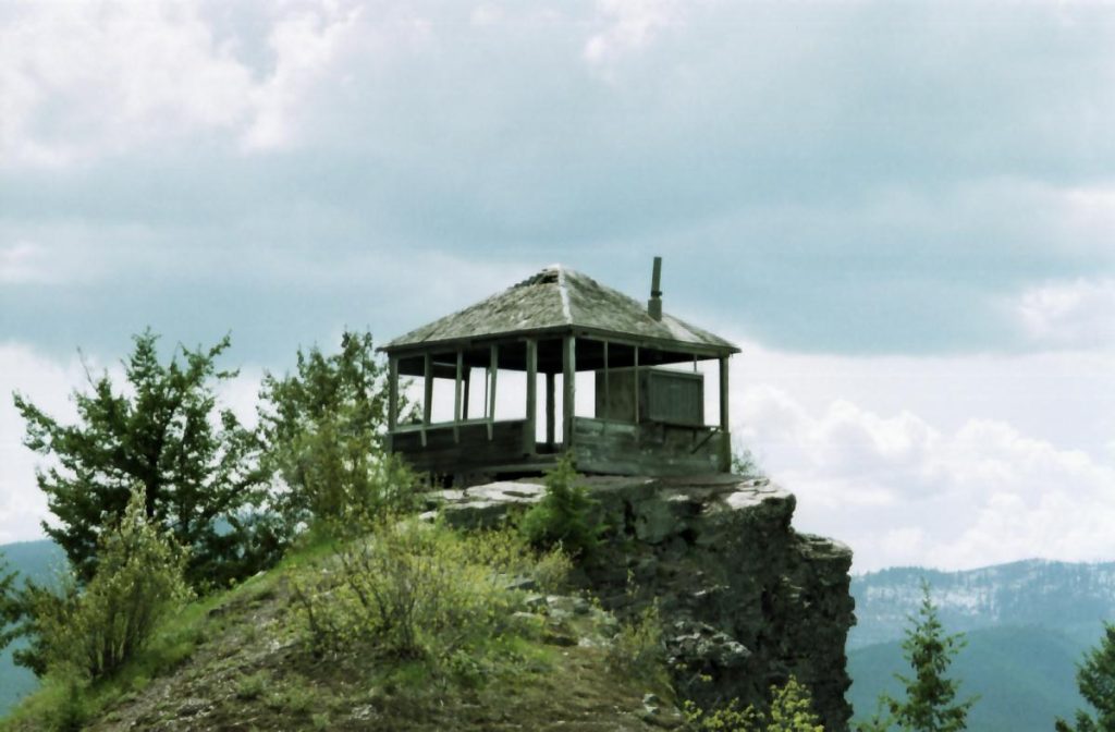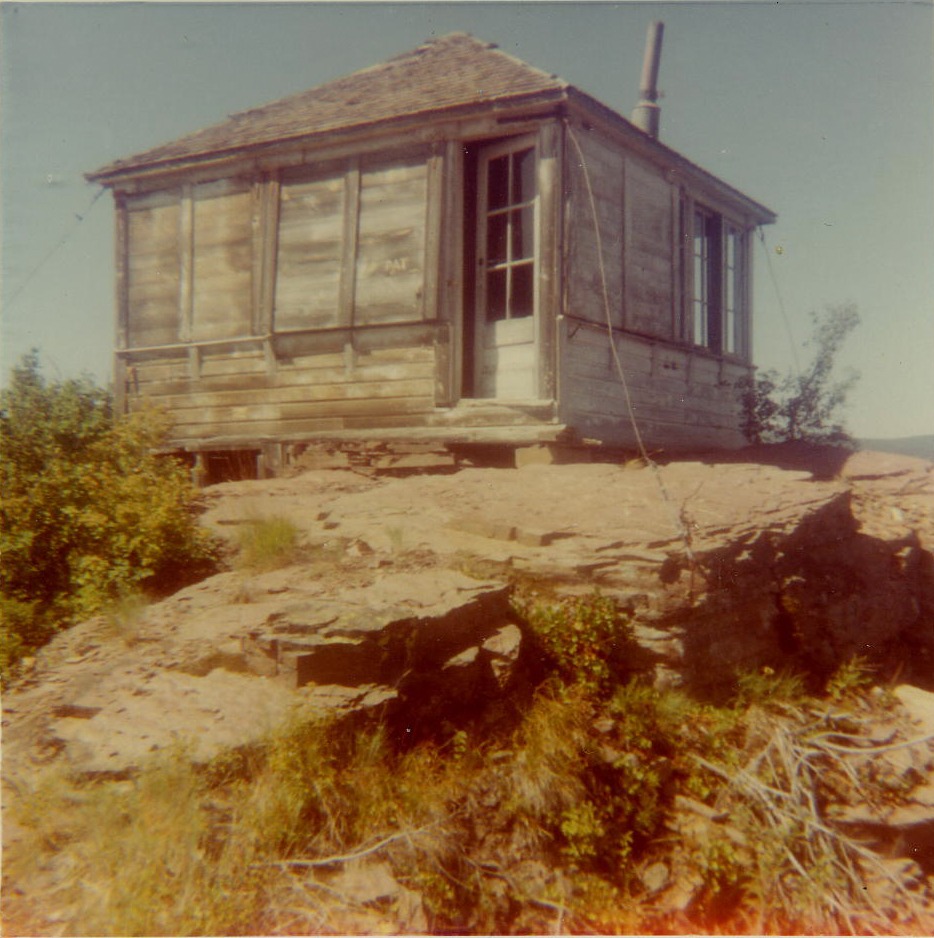 Gary Weber shared with us, “Delyle collapsed during the winter of 2007-2008. I don’t think I’ve been back there since then, the last pictures I have of it standing were from 1996. I was first there in 1970; it was still in somewhat decent condition then. It was sold in 1976 when the ranger at Sandpoint was getting rid of all the lookouts on the district – except Lunch Pk. The door, windows, and shutters were all that was removed. Sometime after that, someone built a box on one side for hacking falcons.”