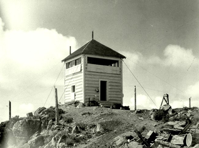 1927 – Two-story log cabin with two-story log barn 1958 – R-6 flat cab on 10′ concrete base 1980 – R-6 added atop previous R-6 2000 – Added to The National Historic Lookout Register